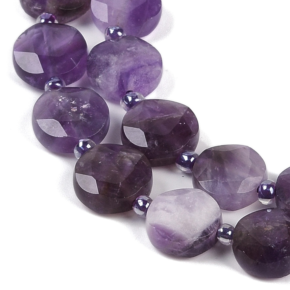 Ametyst, penízky fasetované, 10x6 mm, půlšňůra 19 cm (cca 16 korálků)