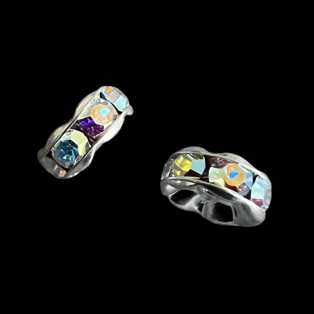 • Mosazná šatonová rondelka, stříbrná s duhovými kamínky, 8 mm, balení 5 ks