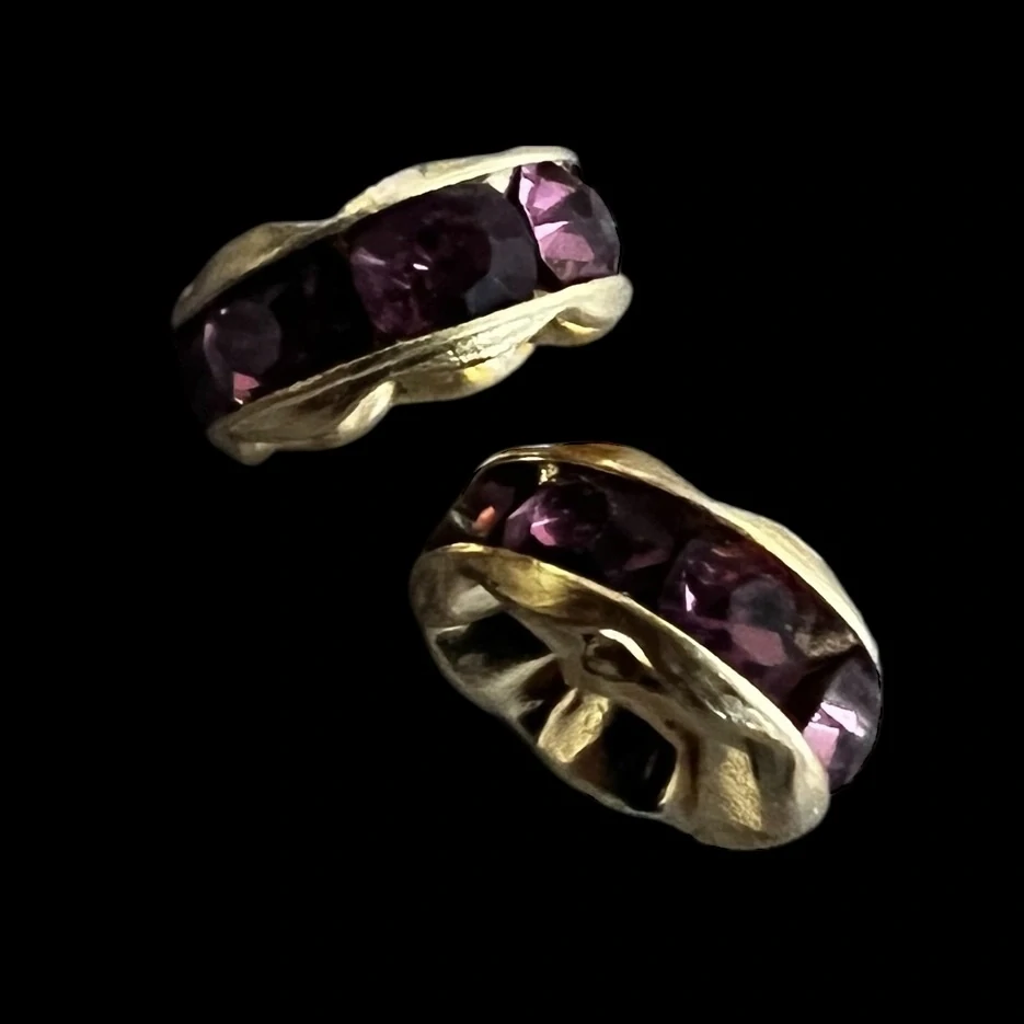 4. Mosazná šatonová rondelka, zlatá s fialovými kamínky, 8 mm, balení 5 ks